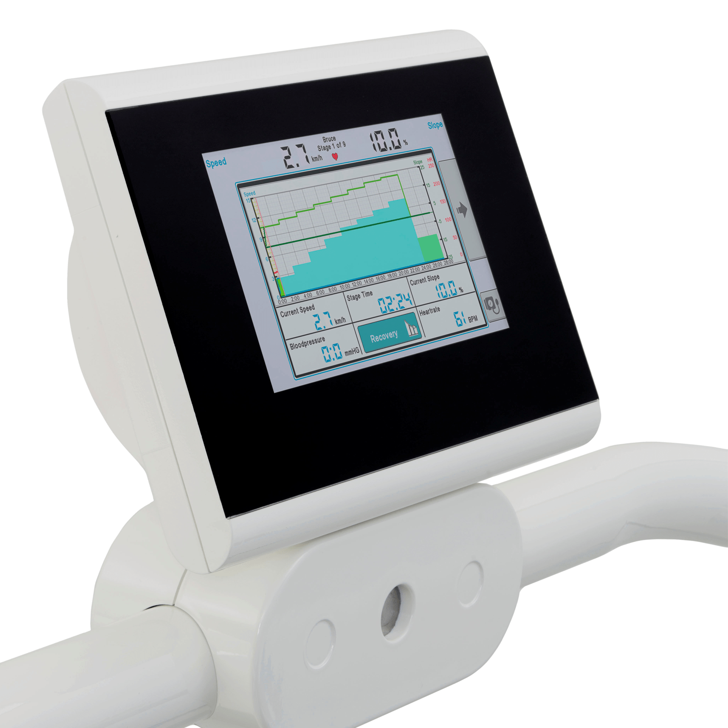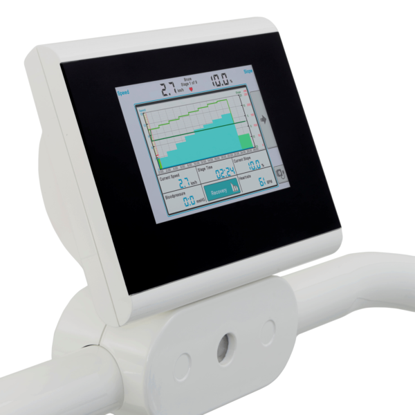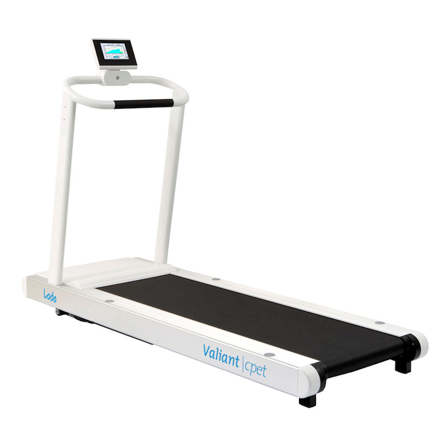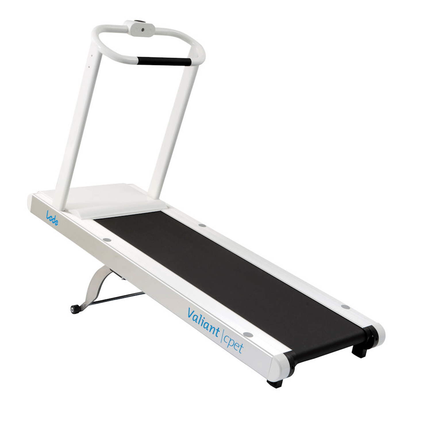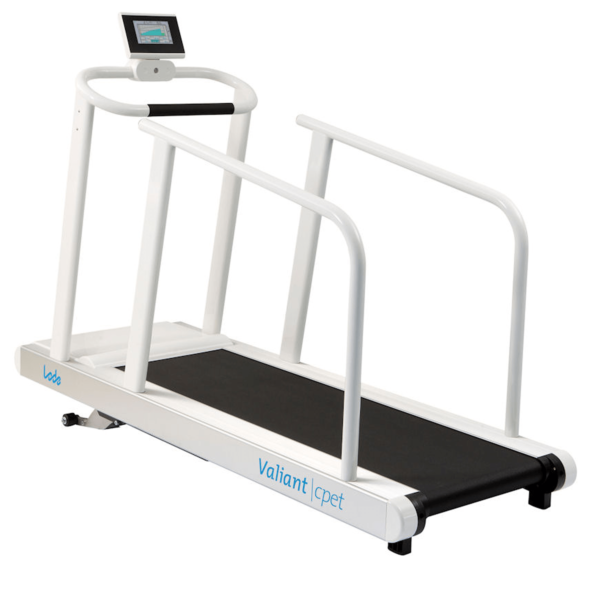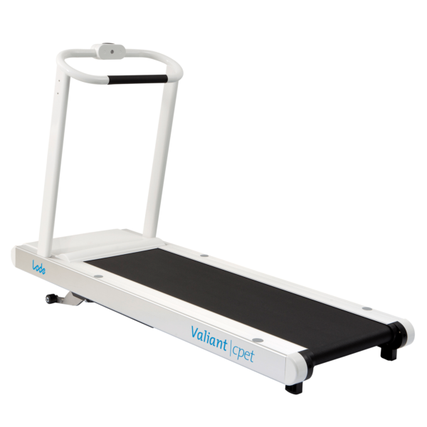 Modern designed treadmill specifically designed for cardio-pulmonary exercise testing. This treadmill is standard supplied with a commUnication module and can therefor be easily controlled by all known stress ECG and pulmonary devices in the world. The low step-up height makes the treadmill perfectly suitable for all test subjects in the field of cardiology, rehabilitation and pulmonary function. The emergency stop with magnetic lanyard on the standard front handrail provides additional safety for the user. The Valiant 2 cpet offers a smooth acceleration from 0 km/h and is continuously adjustable in a range of 0,5 – 20 km/h (0.3 – 12 mph). The standard elevation is 0 – 25% and the running surface of this treadmill is 60 x 170 cm. The Valiant cpet is standard supplied without any display.