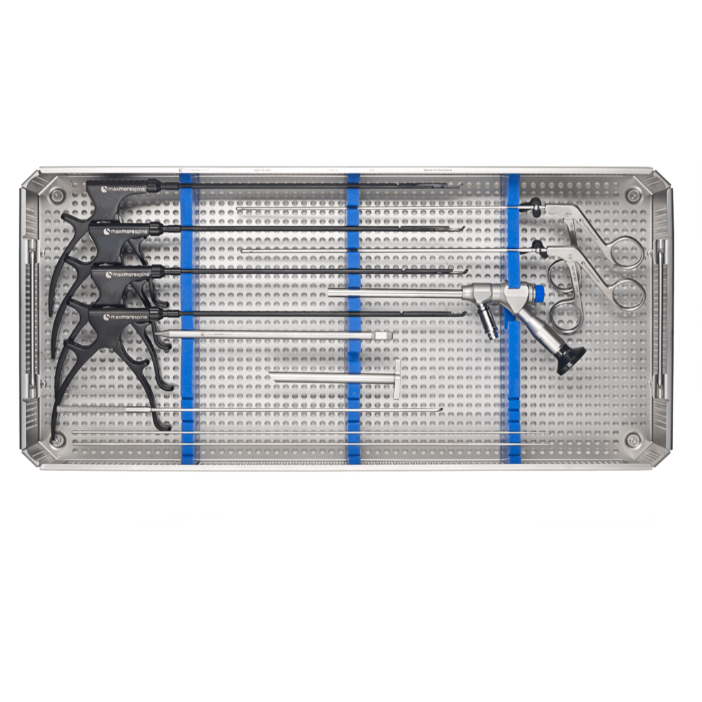 Lumbar spinal decompression is performed with a posterior interlaminar approach. A skin incision of app. 8-9mm is made in the interlaminar window. A conical blunt dilator is introduced in the interlaminar window. A working cannula is introduced over the dilator with the beveled opening of the working cannula directed medially towards the ligamentum flavum. Sequential trimming of the Inferior articular process- Superior Lamina, Superior articular process – Inferior lamina is performed with motorised drills & Kerrison rongeurs.