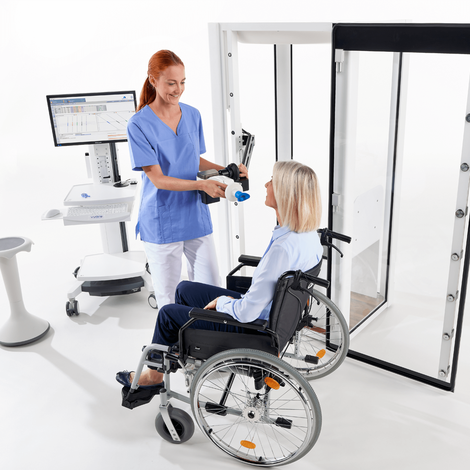 Vyntus BODY offers a spacious plethysmograph (1,110 L) and is equipped with a reinforced bench supporting up to 551 lbs. The all-glass cabin and glowing LED status lights help to create a welcoming environment for most patients.